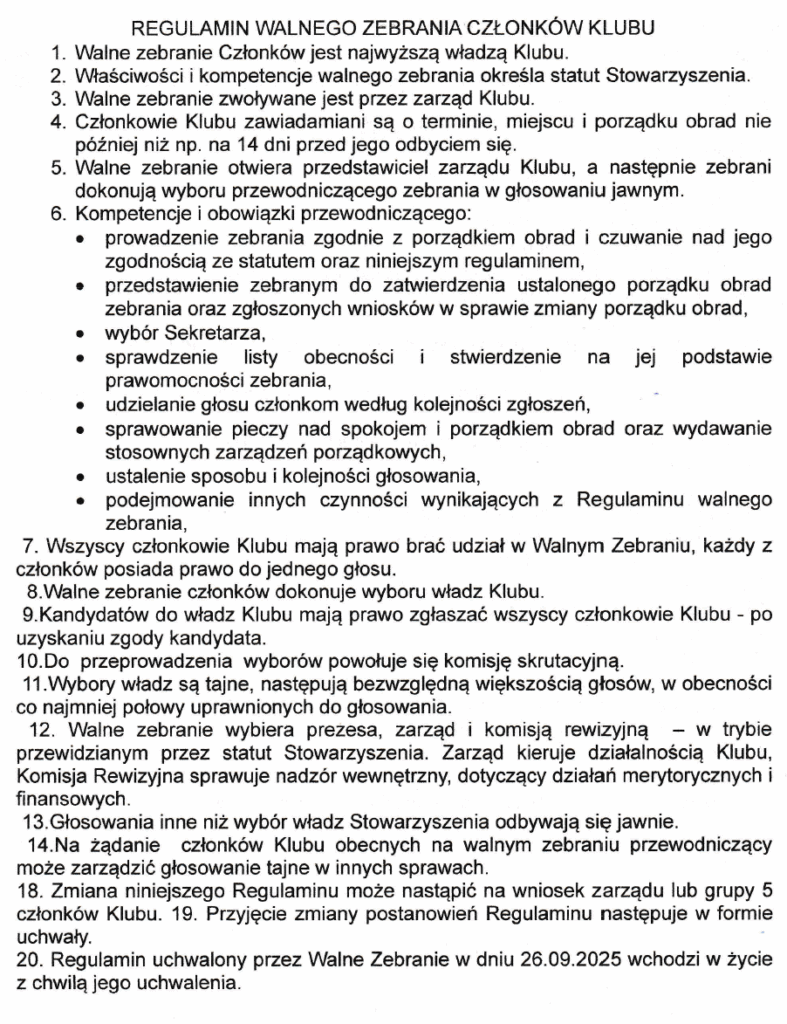Regulamin i program zebrania walnego Opublikowano 2025-09-252025-09-26 Aby usprawnić organizację nadchodzącego zebrania walnego, poniżej przedstawiamy jego agendę / program obrad: program i regulamin walnegoPobierz Poniżej przedstawiamy regulamin z zebrania walnego i prosimy wszystkich członków i zapoznanie się z nim: