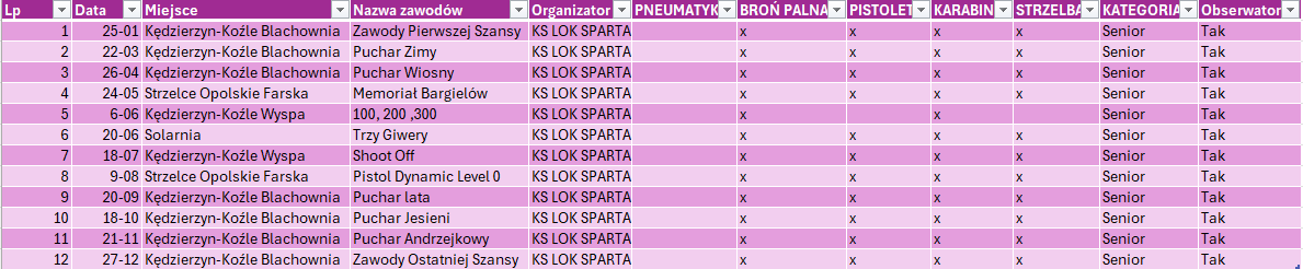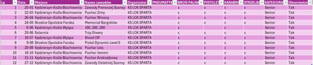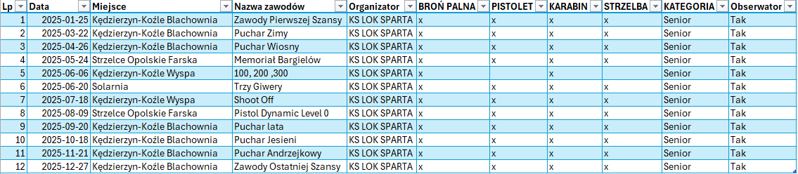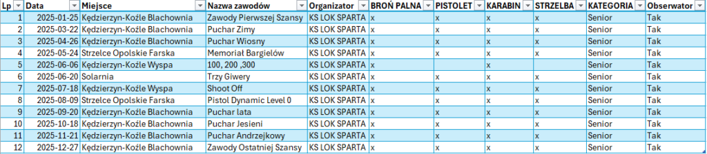 | Lp | Data | Miejsce | Nazwa zawodów | Organizator | BROŃ PALNA | PISTOLET | KARABIN | STRZELBA |